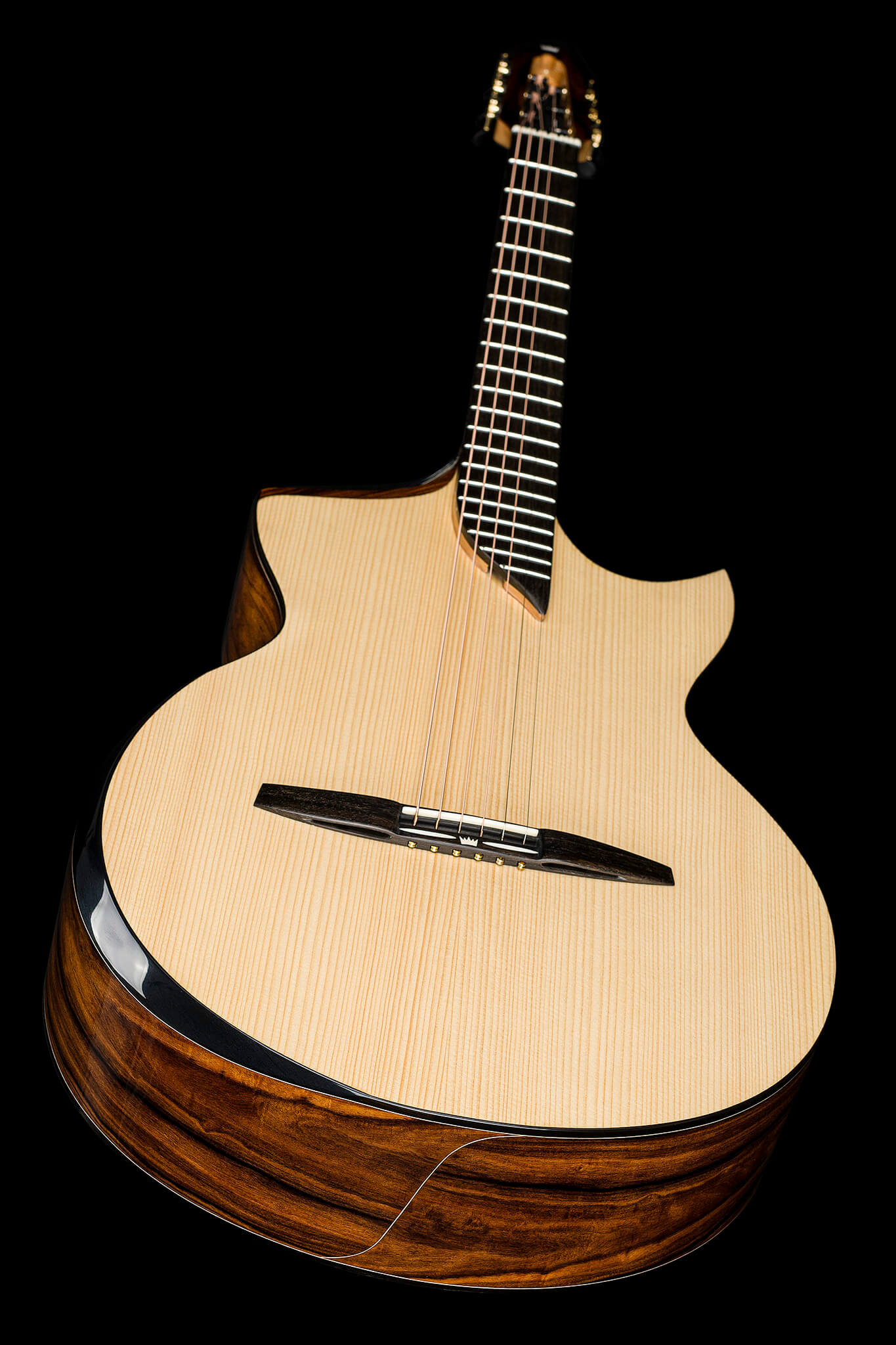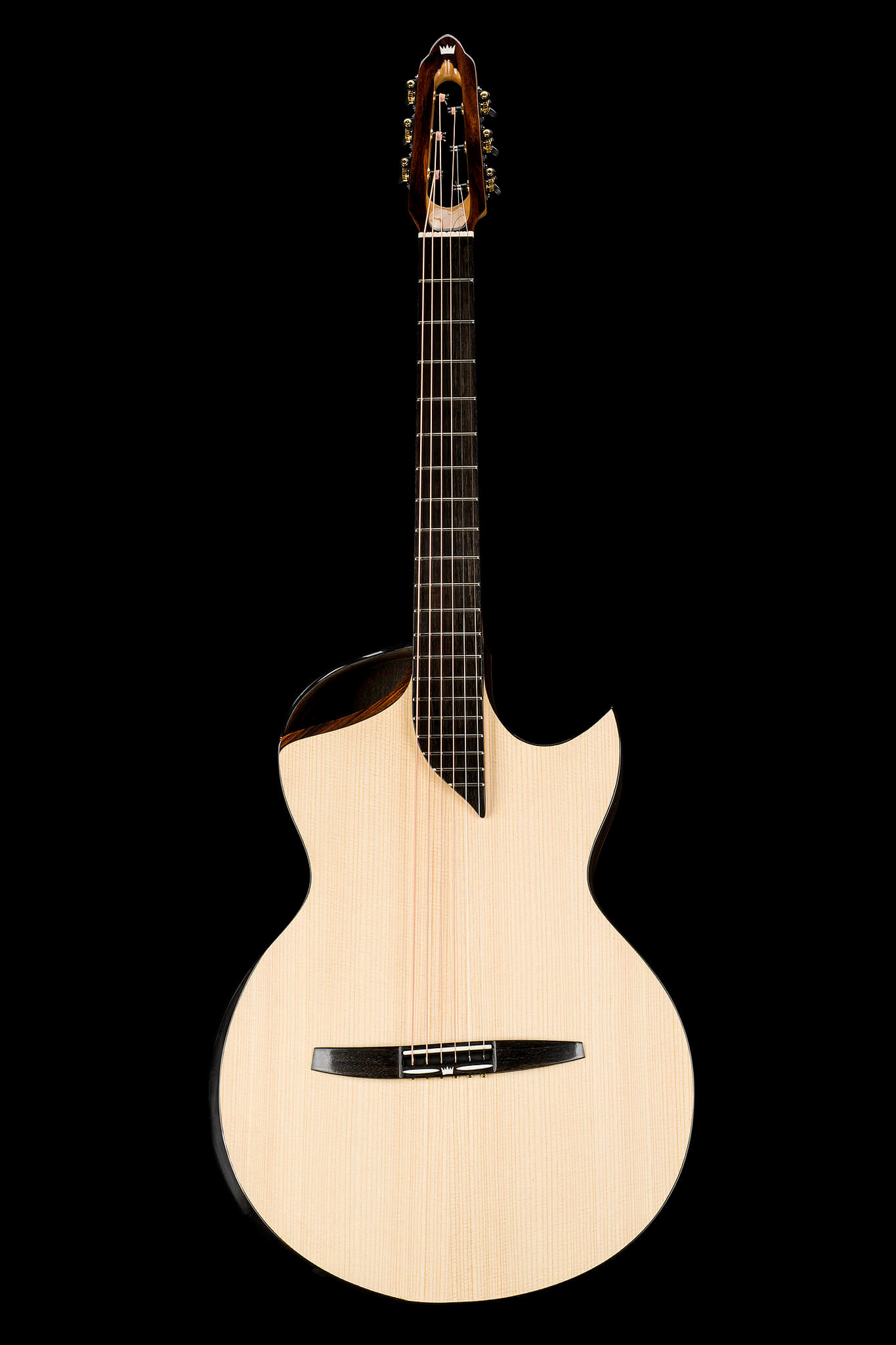 - Einzelnes versetztes Schallloch mit Rosette aus bolivianischem Palisanderholz in Spezial-Schwarz
