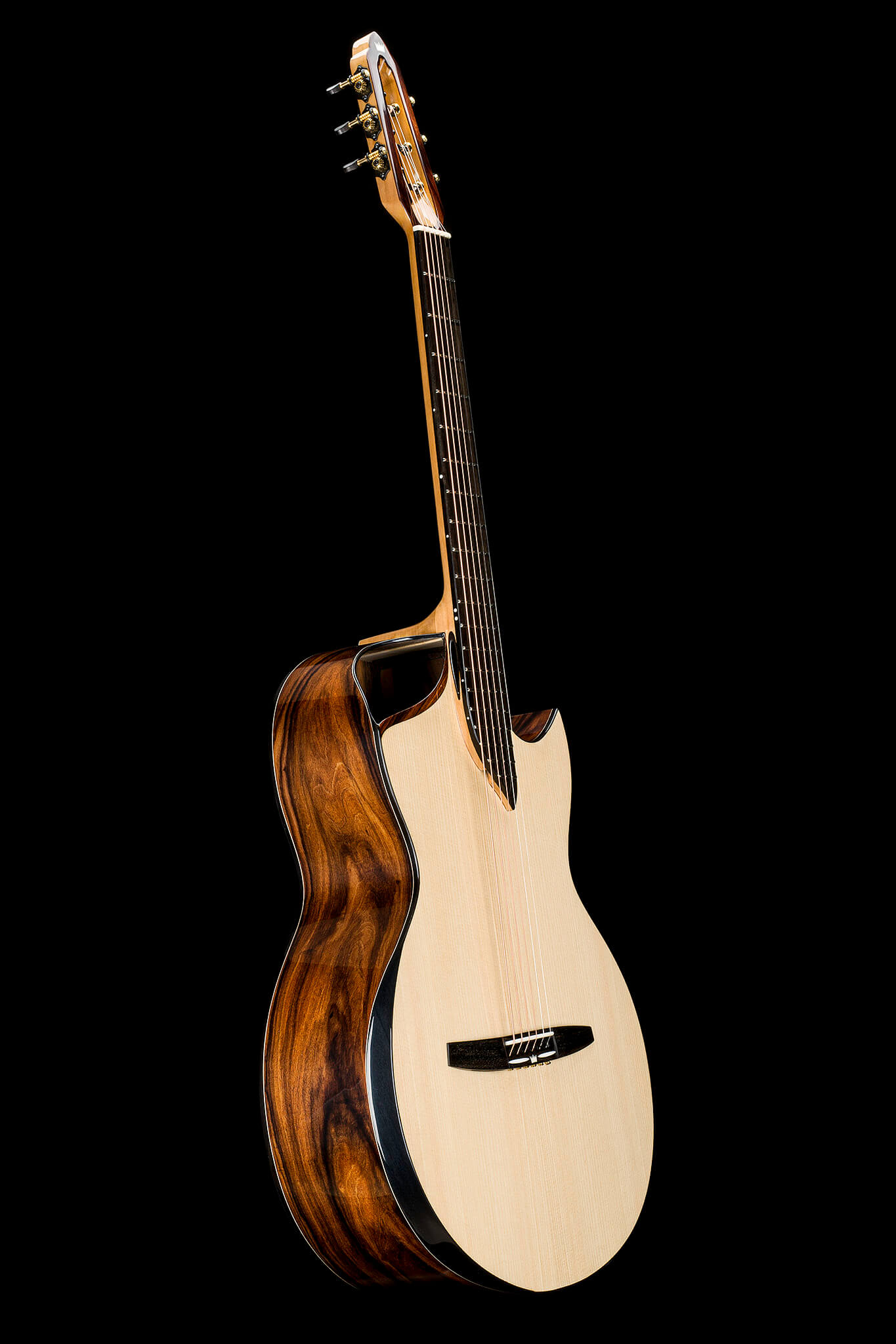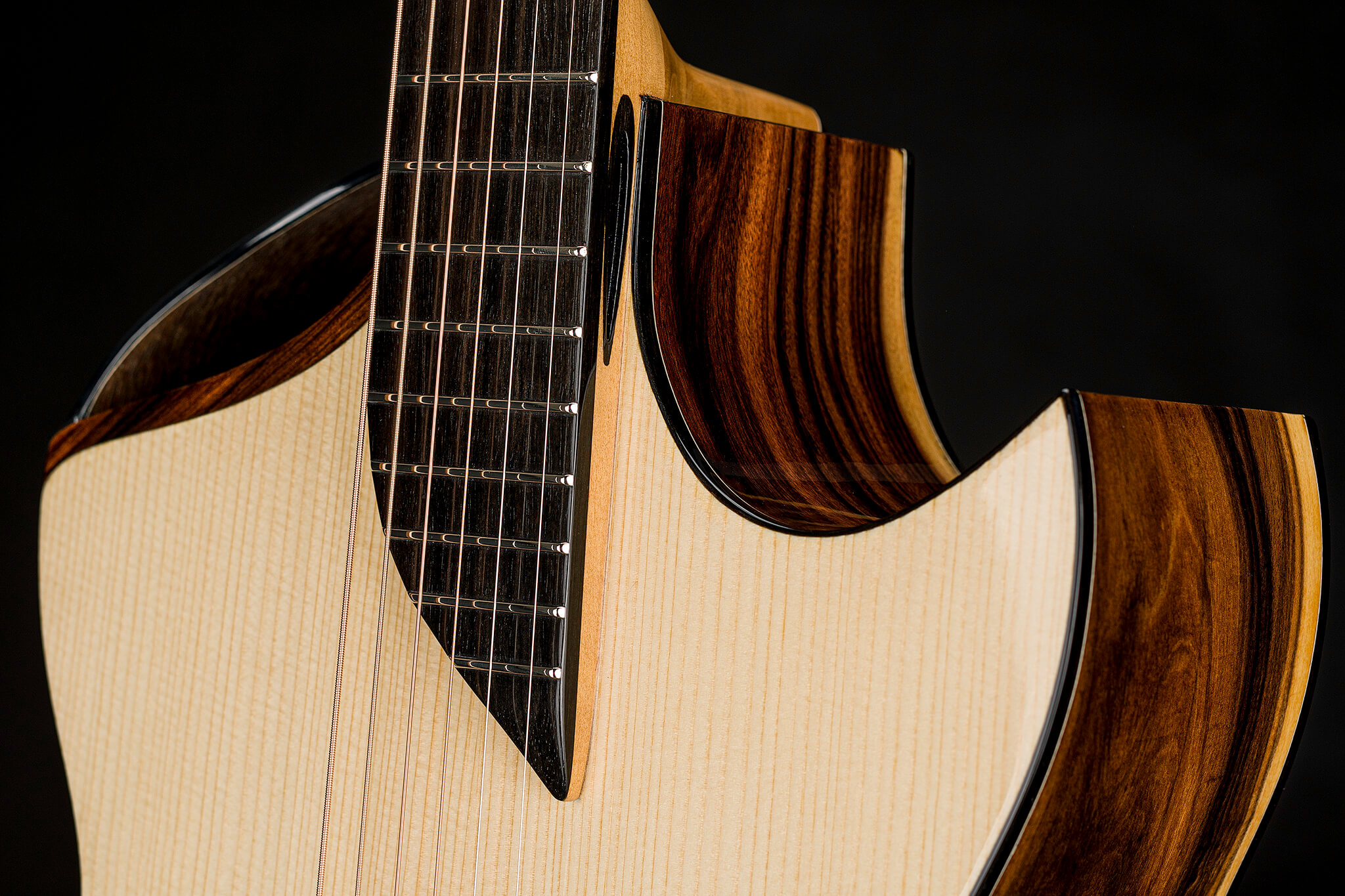 - weltweit erste ‚ACOUSTIC TUBES‘ im Gitarrenhals (Europäisches Patentamt EP 3340231) mit Ebenholzauslässen