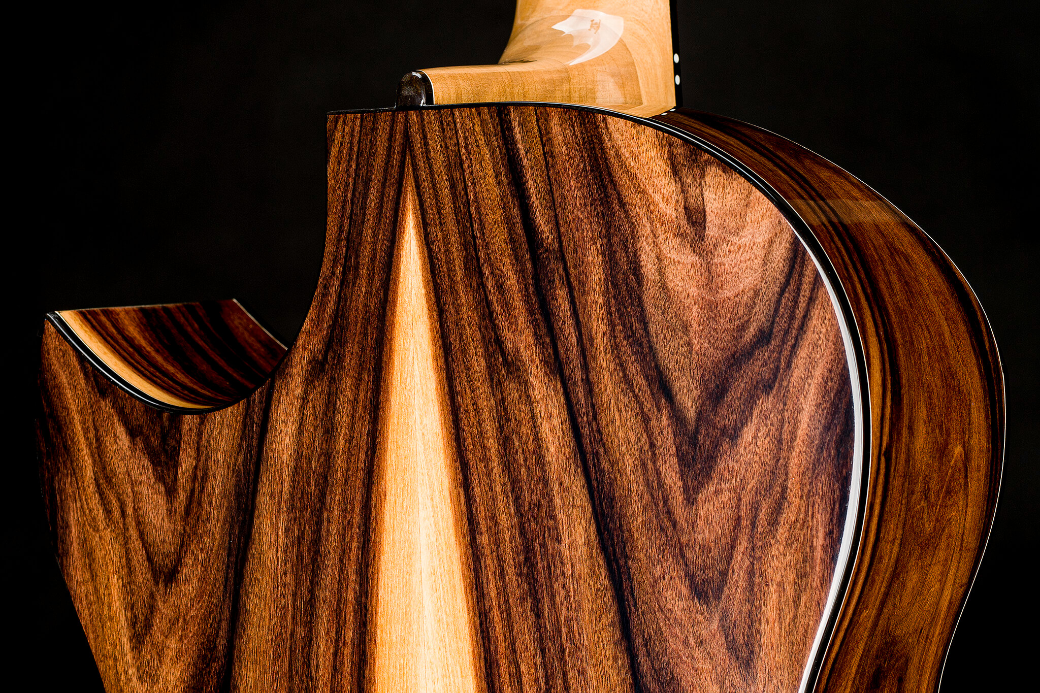- Rückseite und Zargen aus bolivianischem Palisanderholz in Spezial-Schwarz mit Splintholz