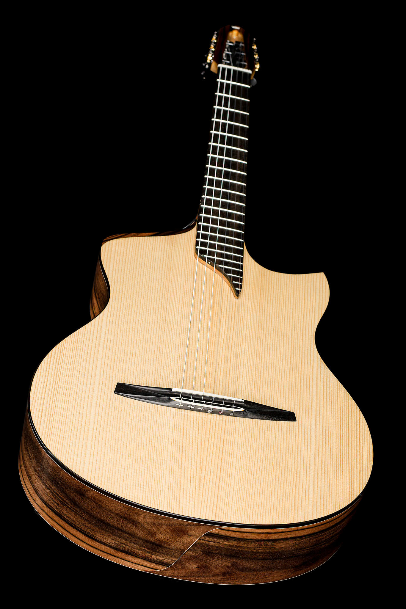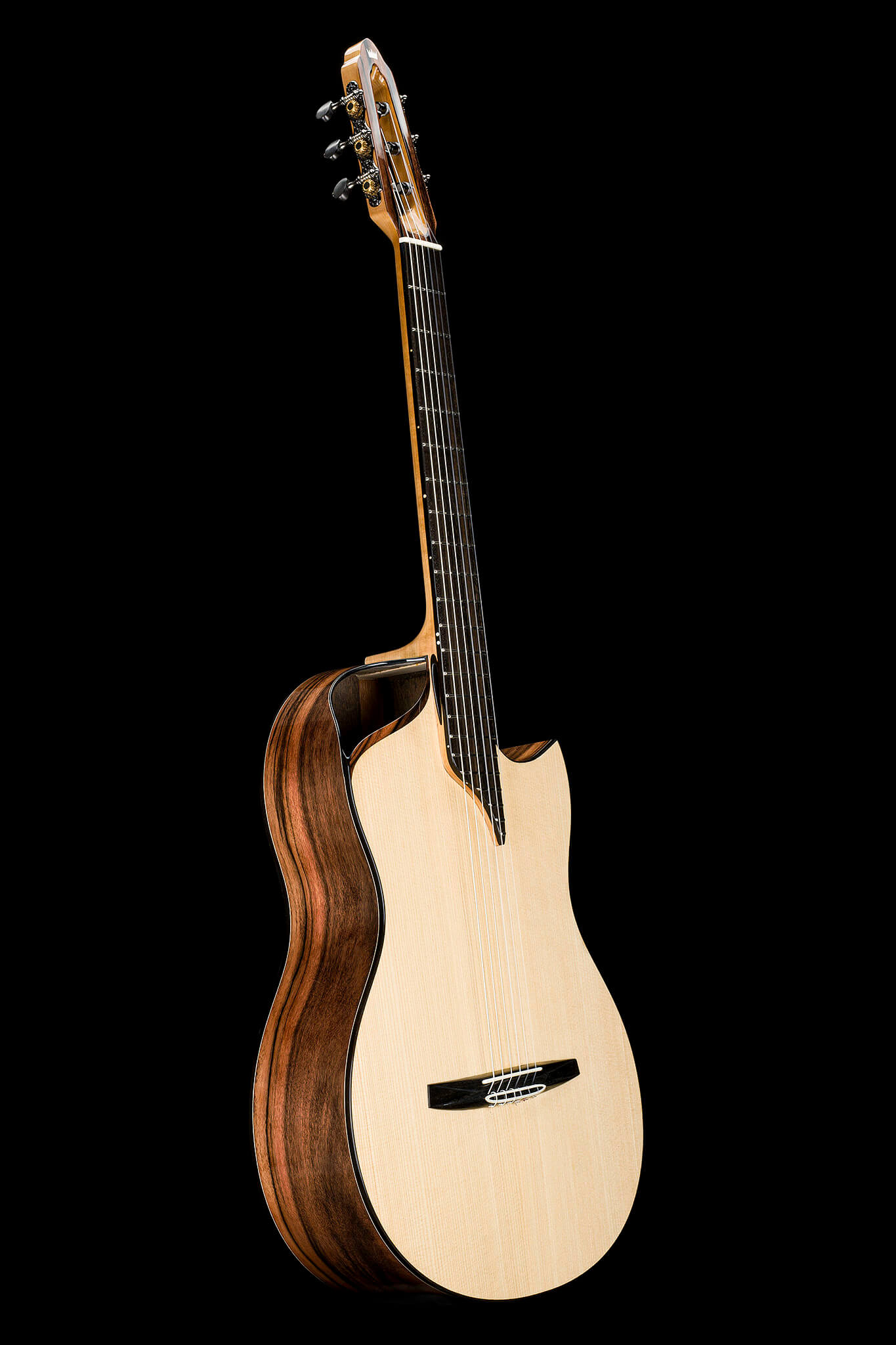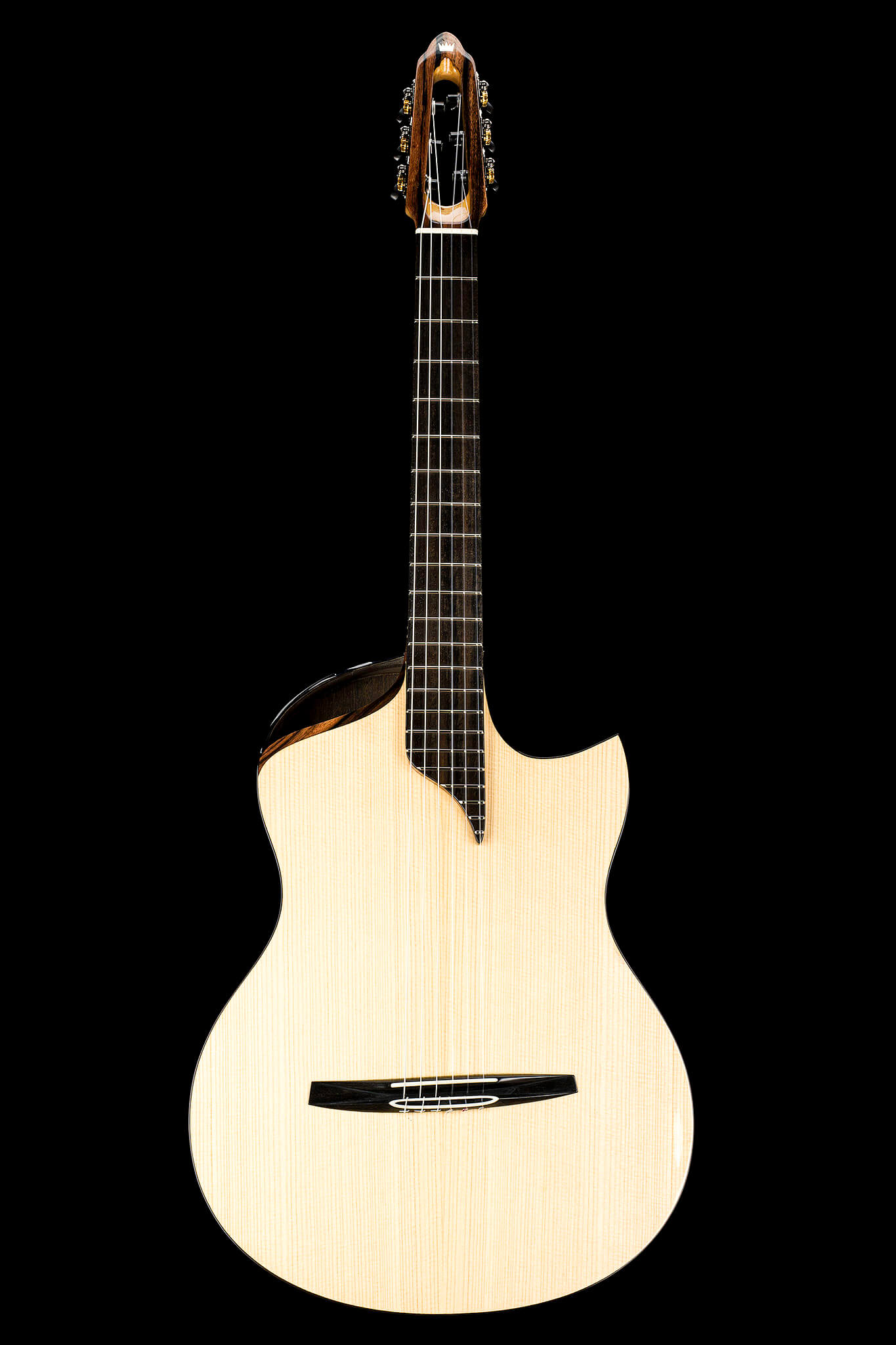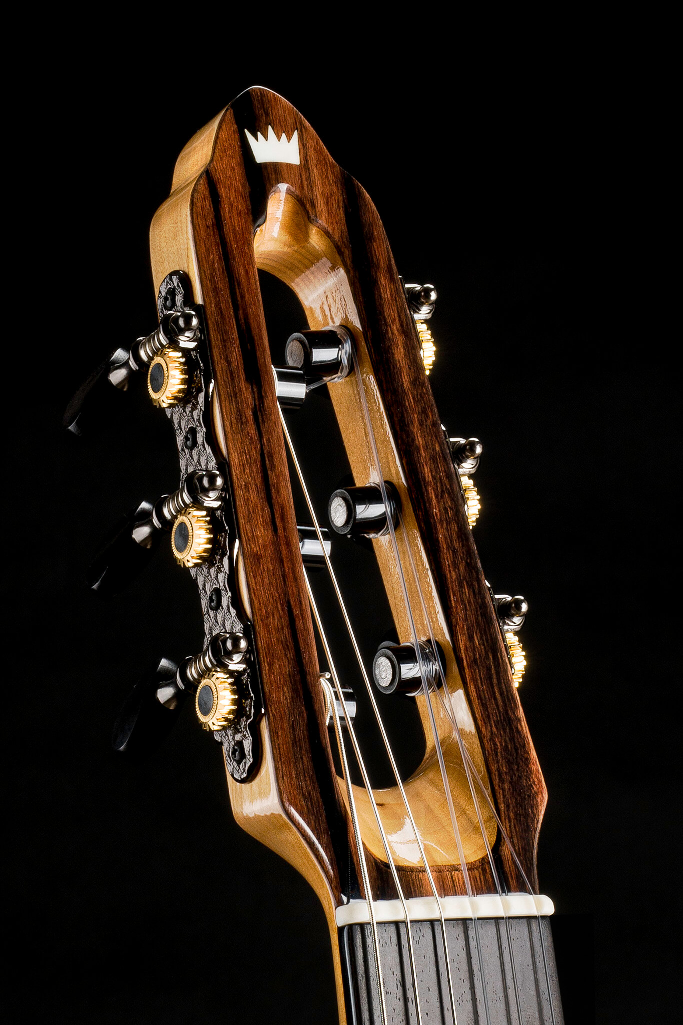 - Hochwertige, kosmos-schwarze Stimmmechaniken mit Ebenholzknöpfen, schwarzen Aluminiumrollen mit Lagern, Schraubeinlage, Übersetzung 18:1