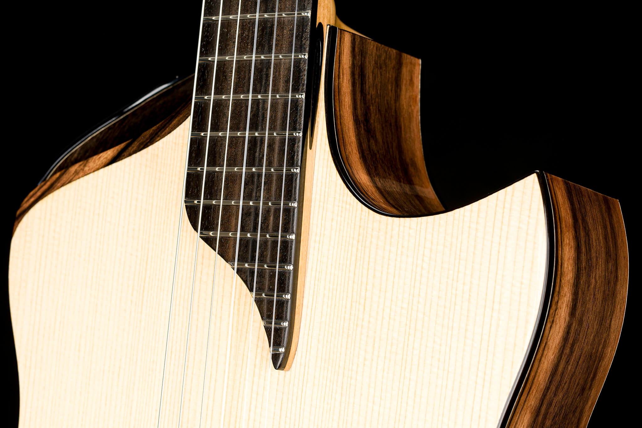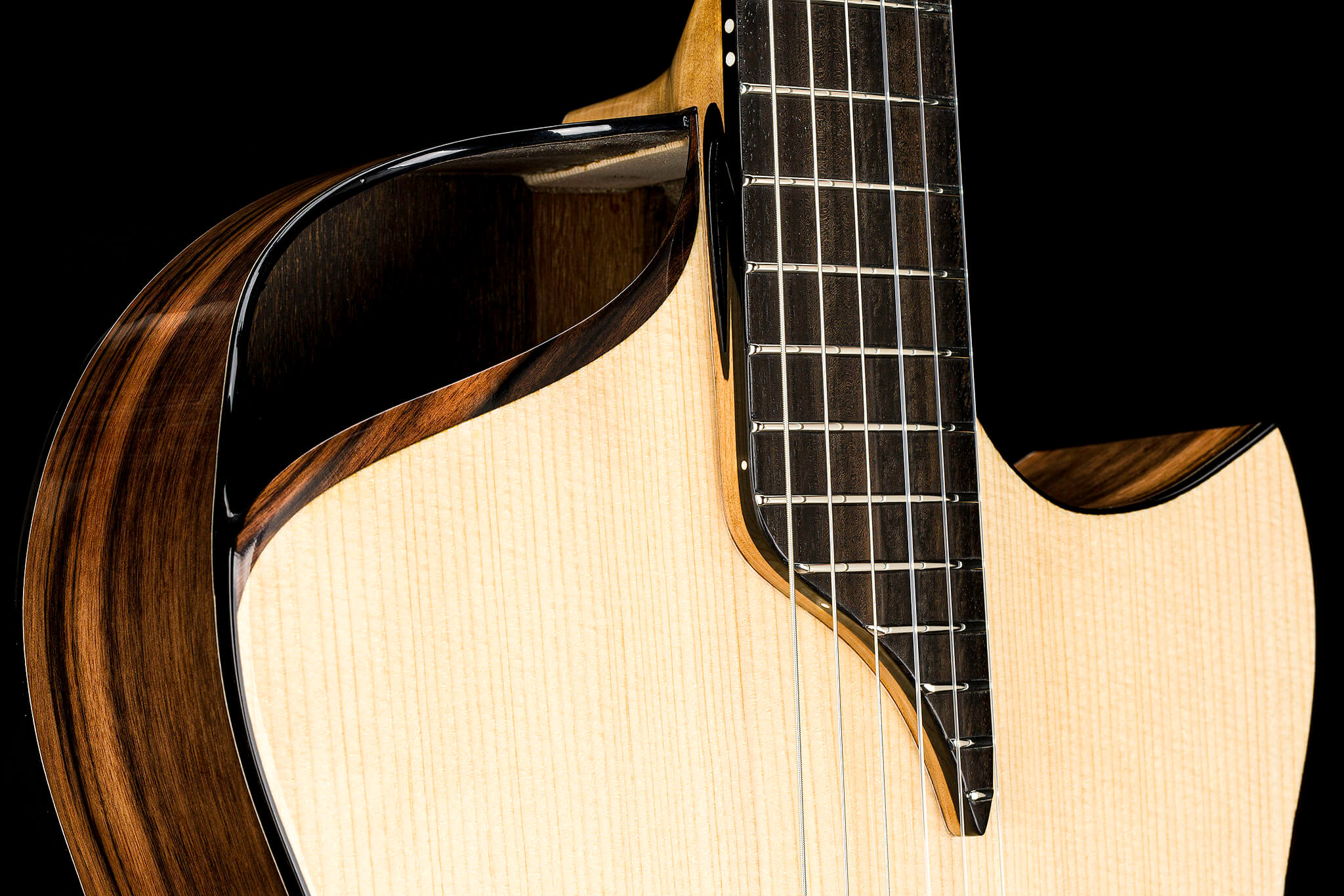 - Weltweit erste „ACOUSTIC TUBES“ im Gitarrenhals (Europäisches Patentamt EP 3340231) mit Auslässen aus Ebenholz