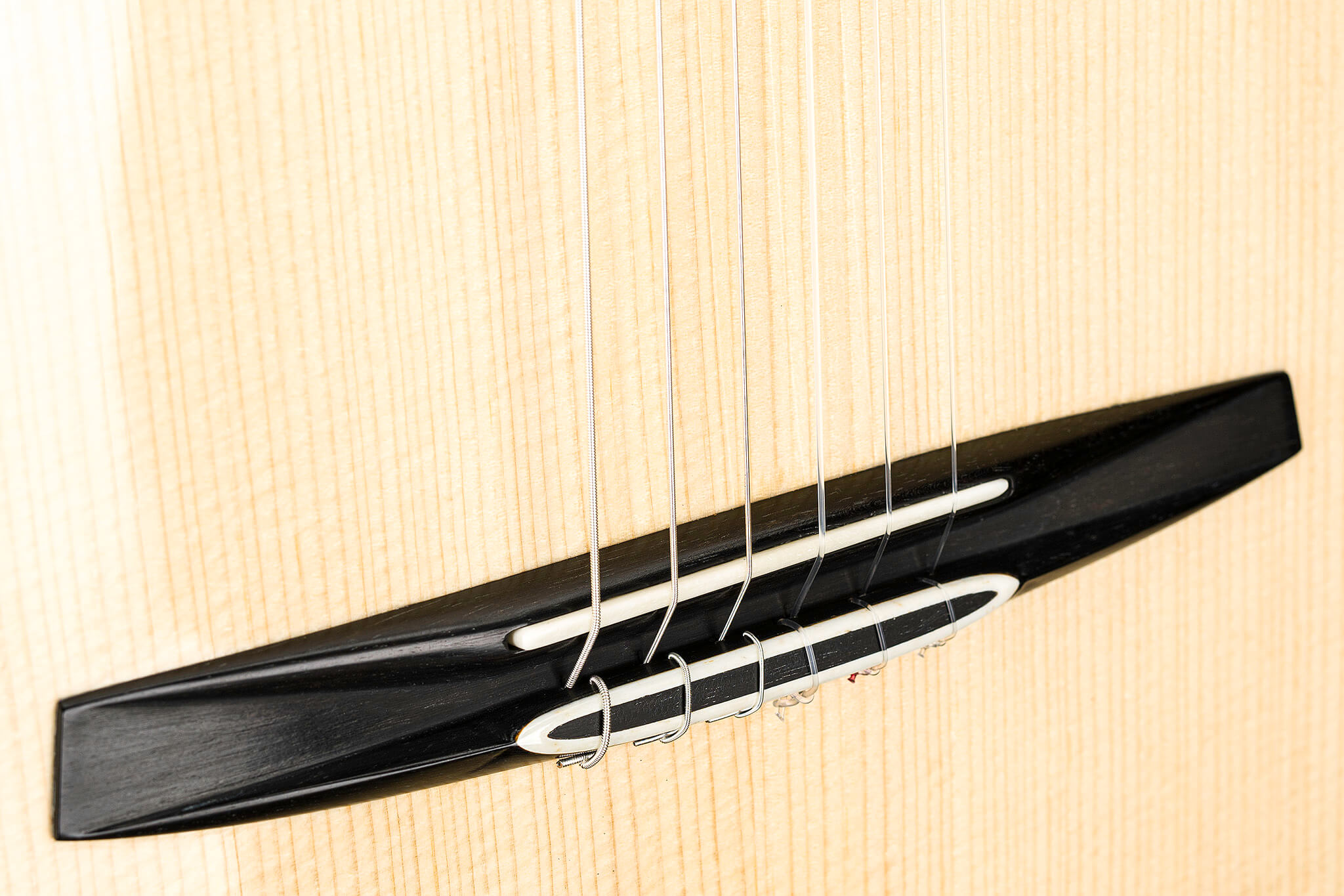 - Innovative, handgeformte Impedanzbrücke aus afrikanischem Ebenholz mit Versteifungsflügeln, die mit Knochen und Ebenholz verziert sind (europäisches Patent Nr. 008177463-0003)