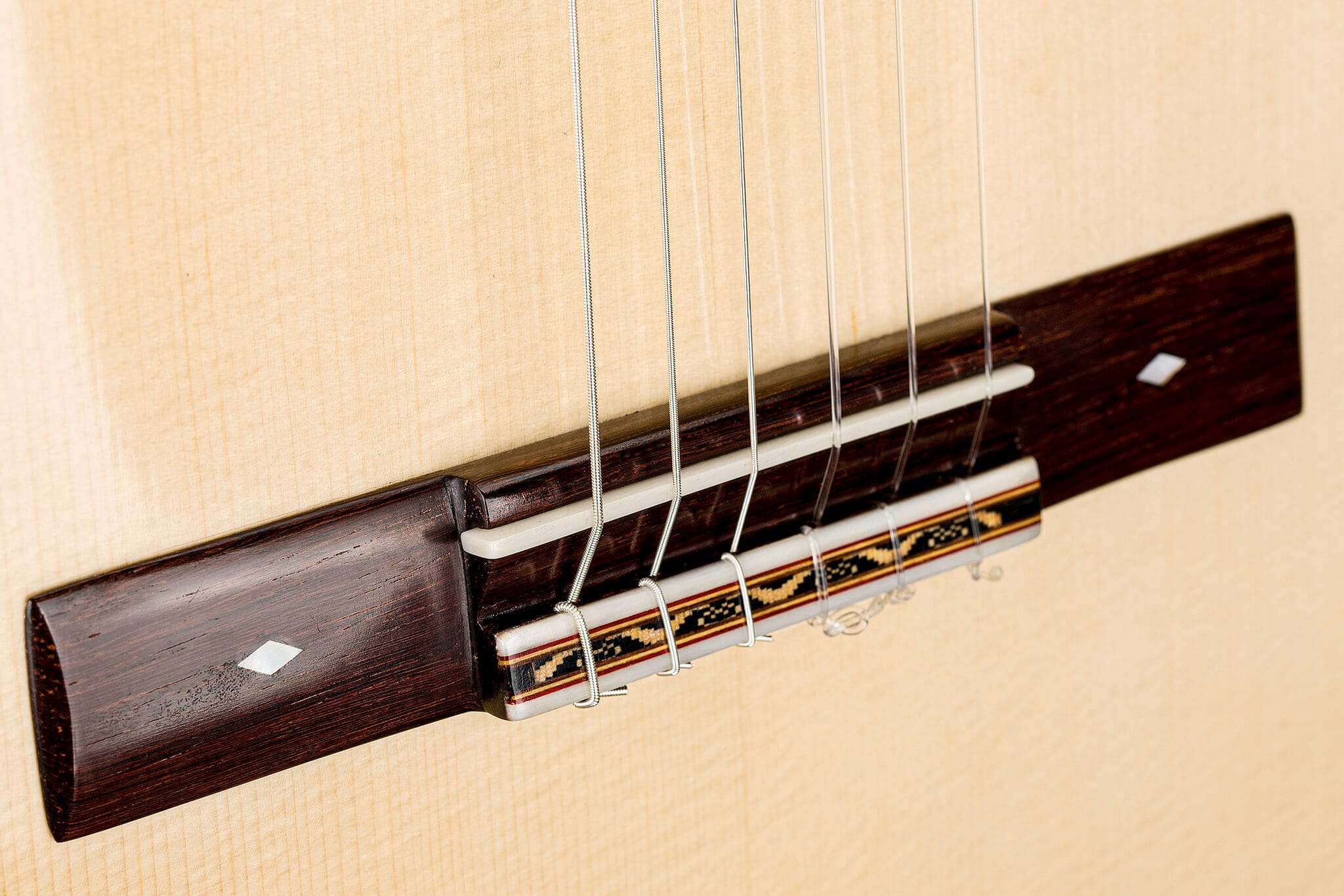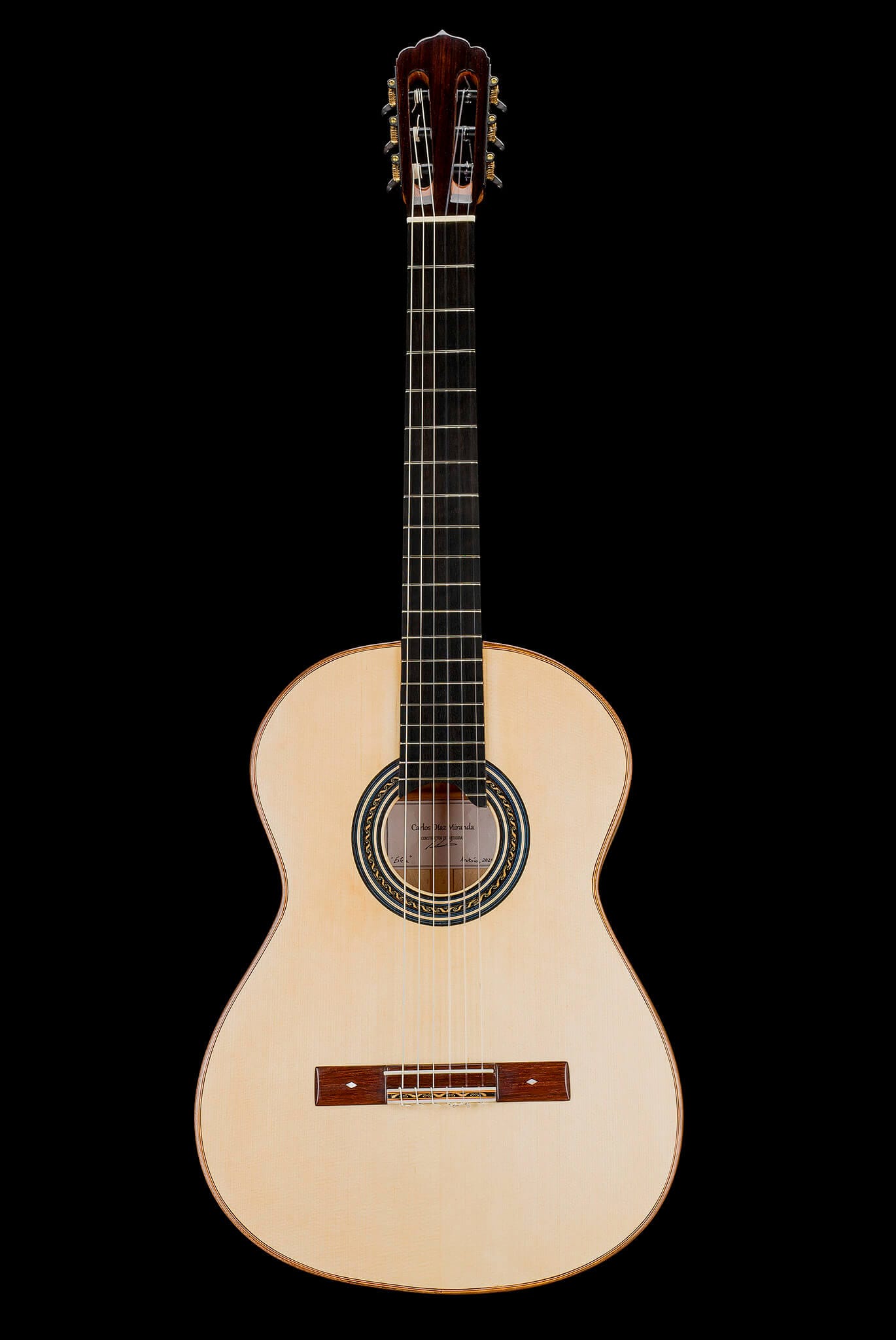 A classical guitar made by young luthier Carlos Miranda, featuring a spruce top and a body made of flamed maple, with a bright and full sound.