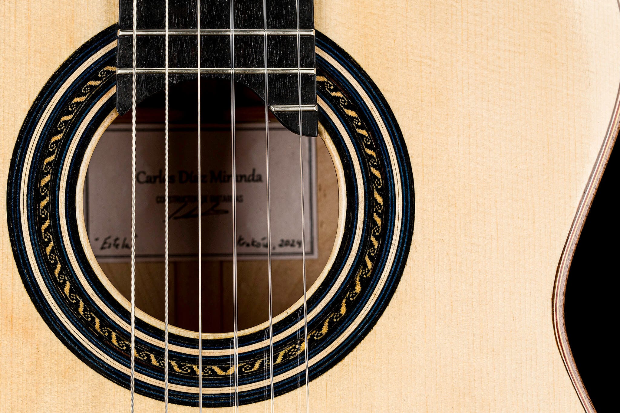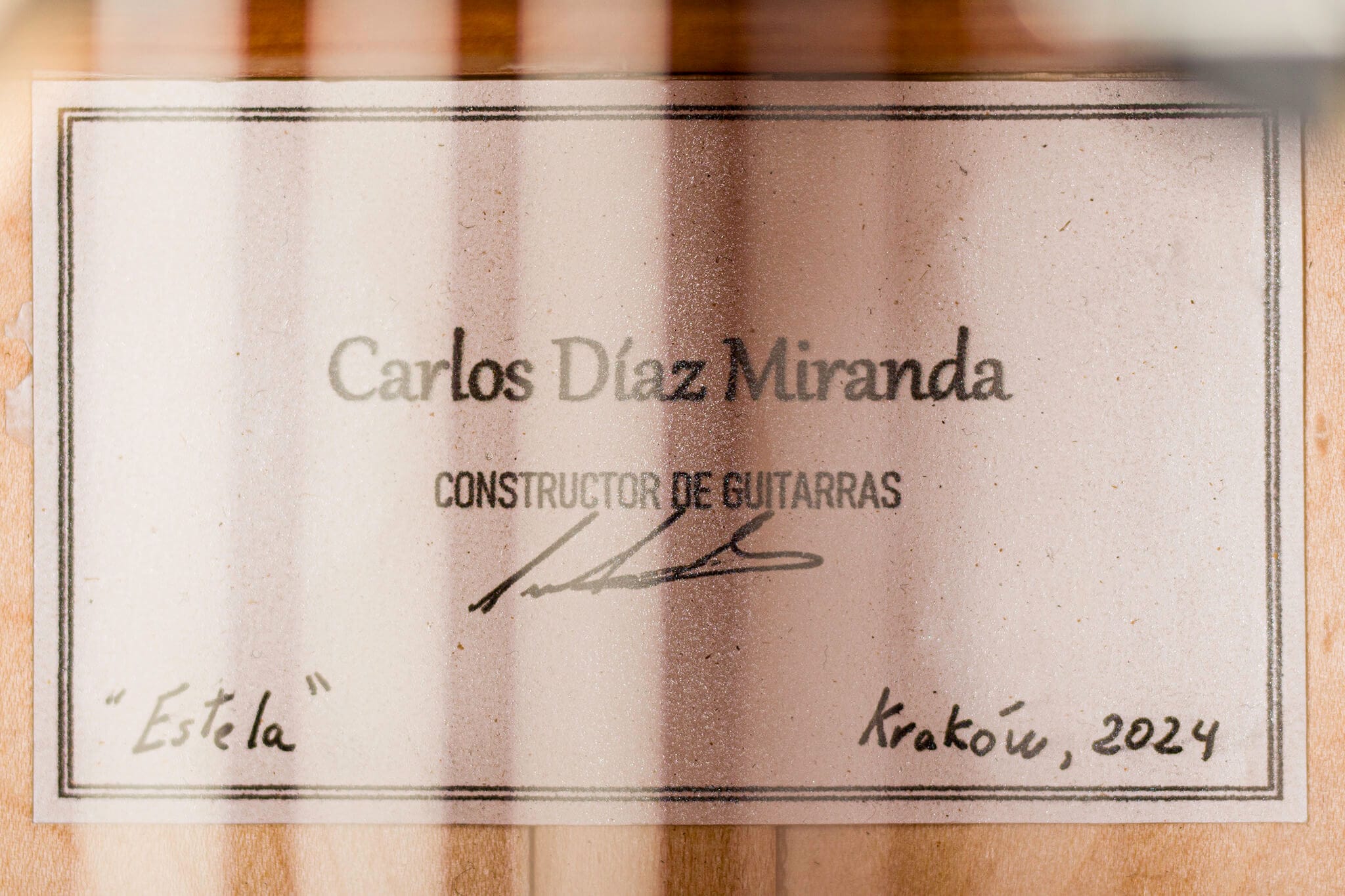 Crafted in 2024 by the talented young luthier Carlos Diaz Miranda, the “Estela” model showcases a refined blend of precision craftsmanship and expressive tonal character. Originally from Chile and now based in Poland, Diaz Miranda brings a fresh, modern approach to traditional guitar making, rooted in Latin American musical heritage and European lutherie standards.