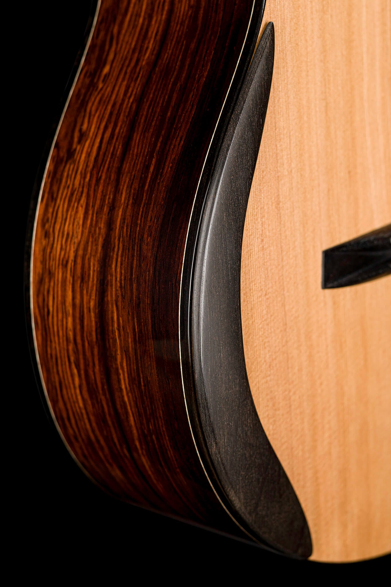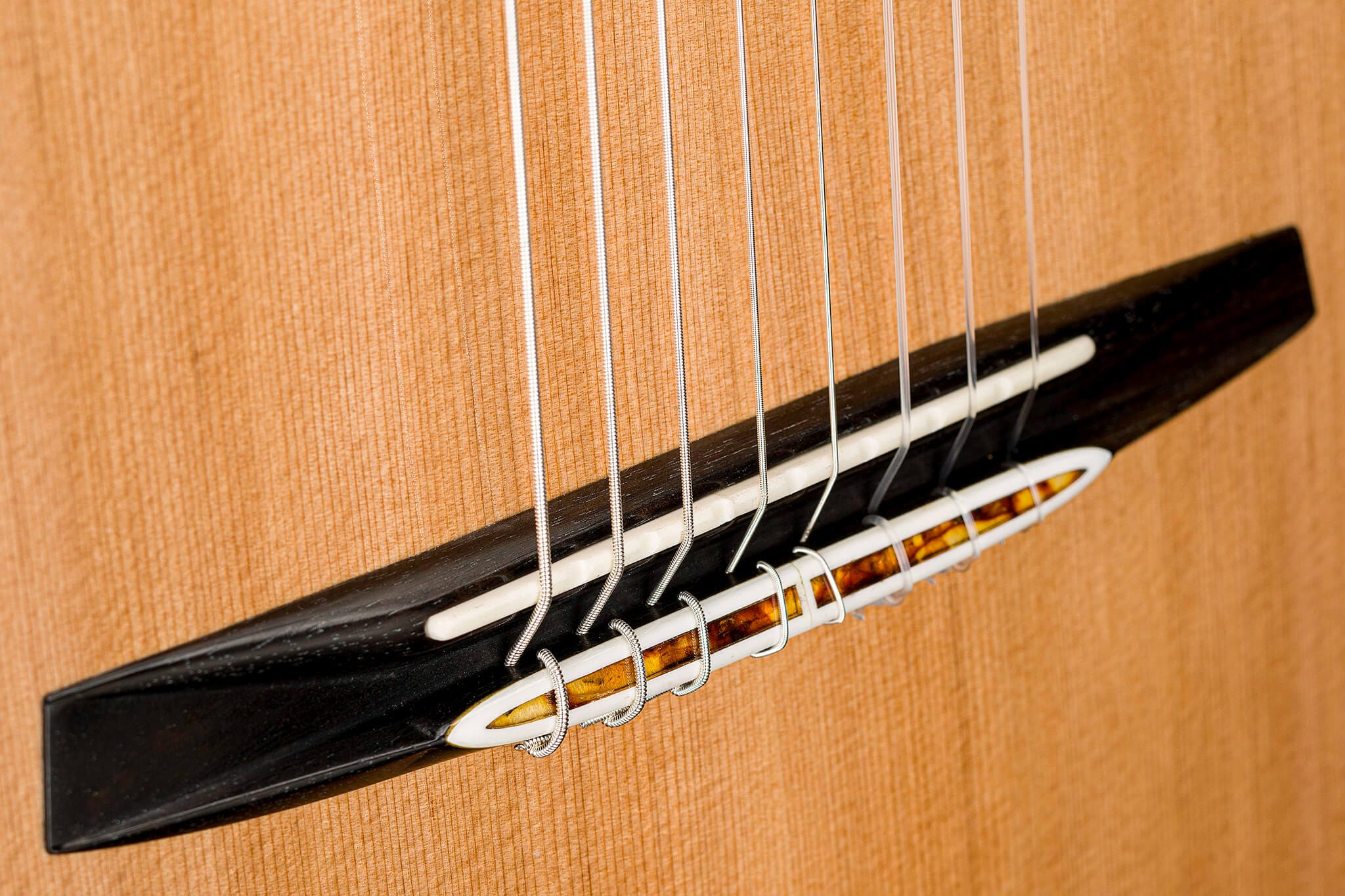- innovative, hand-shaped African Ebony Impedance bridge with stiffening wings encrusted with bone and Baltic amber (European patent no. 008177463-0003)