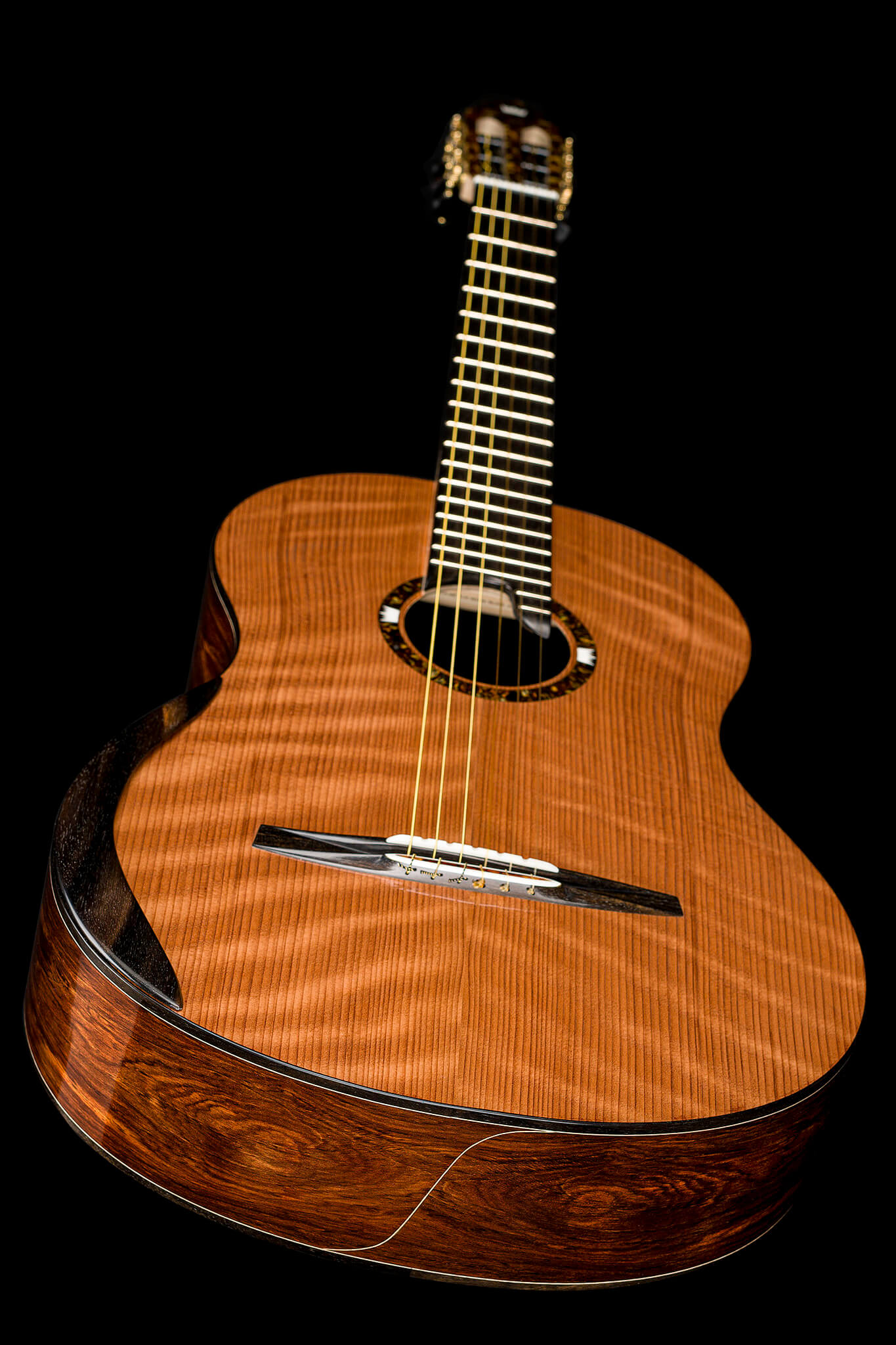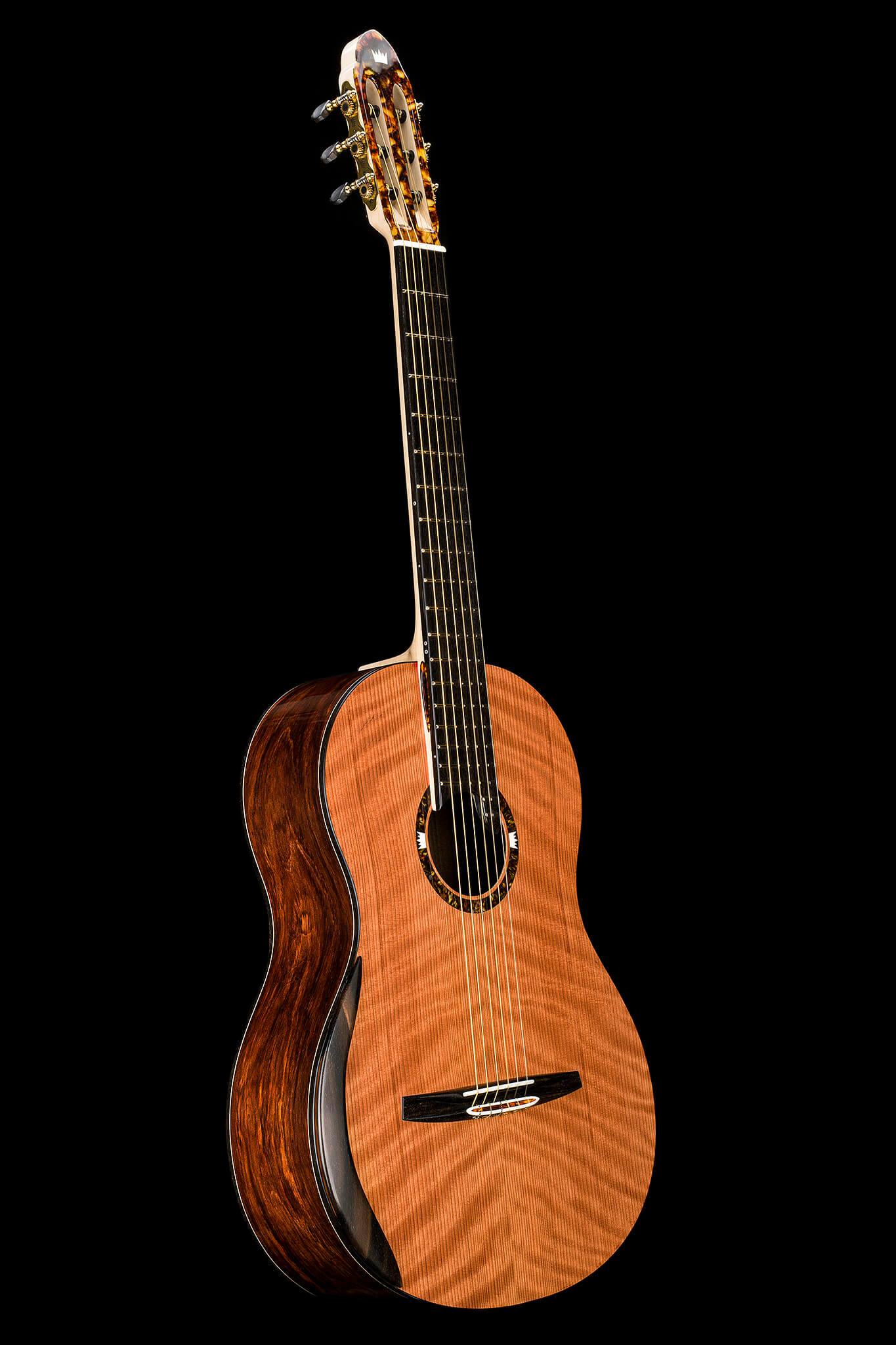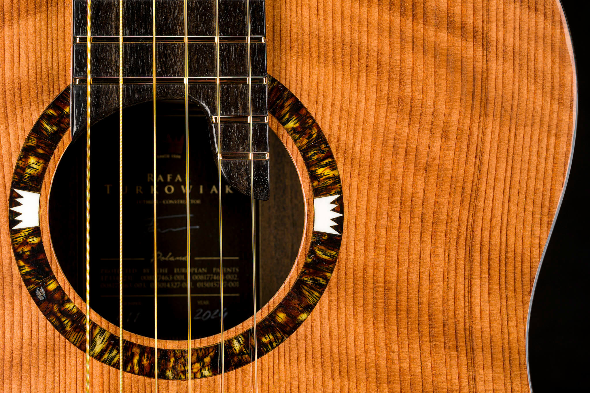 Double-top classical guitar by Rafał Turkowiak featuring a flamed redwood/cedar top and walnut burl body, offering a modern, mesmerizing sound.