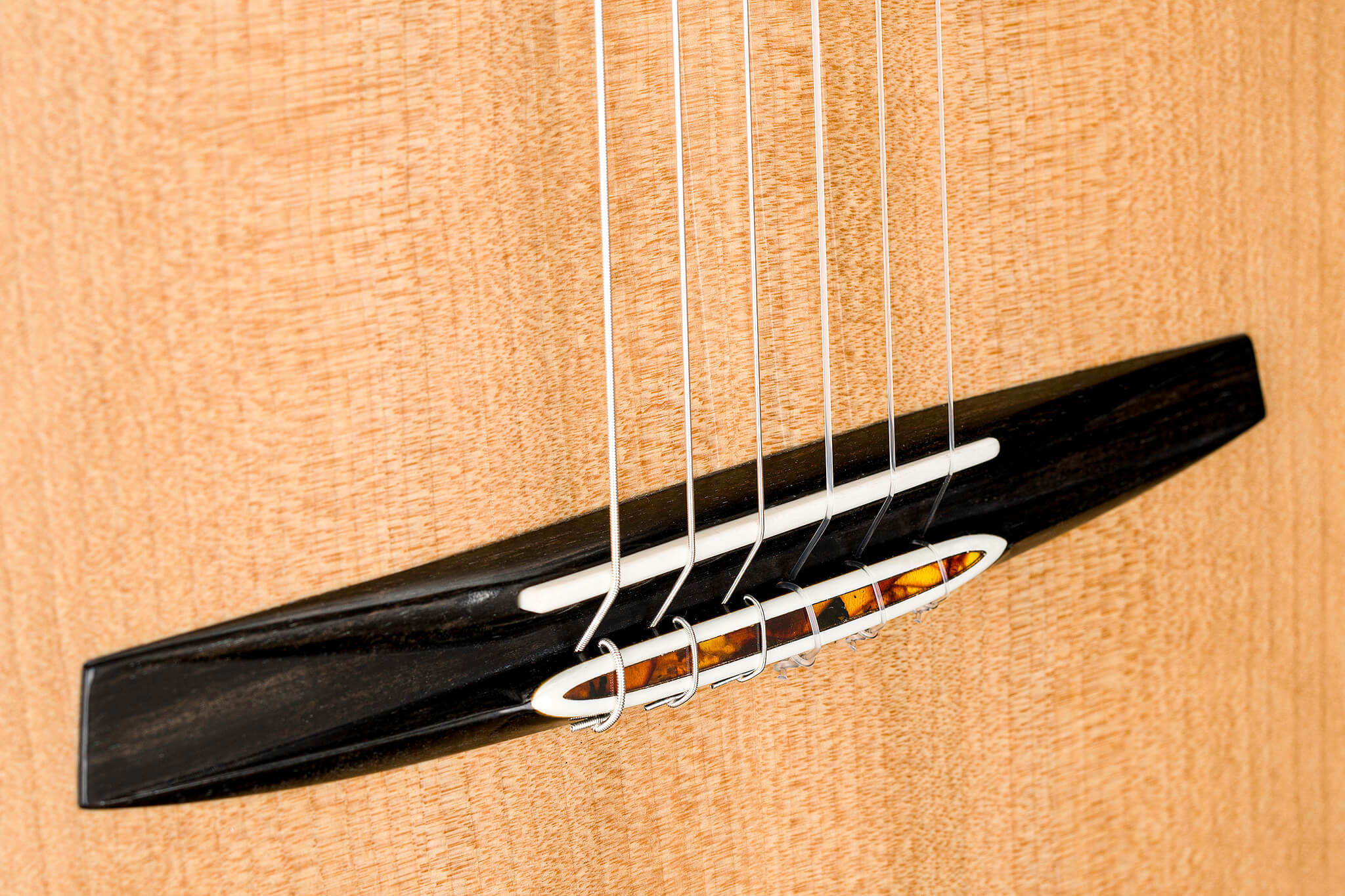 - innovative, hand-shaped African Ebony Impedance bridge with stiffening wings encrusted with bone and Baltic amber (European patent no. 008177463-0003)