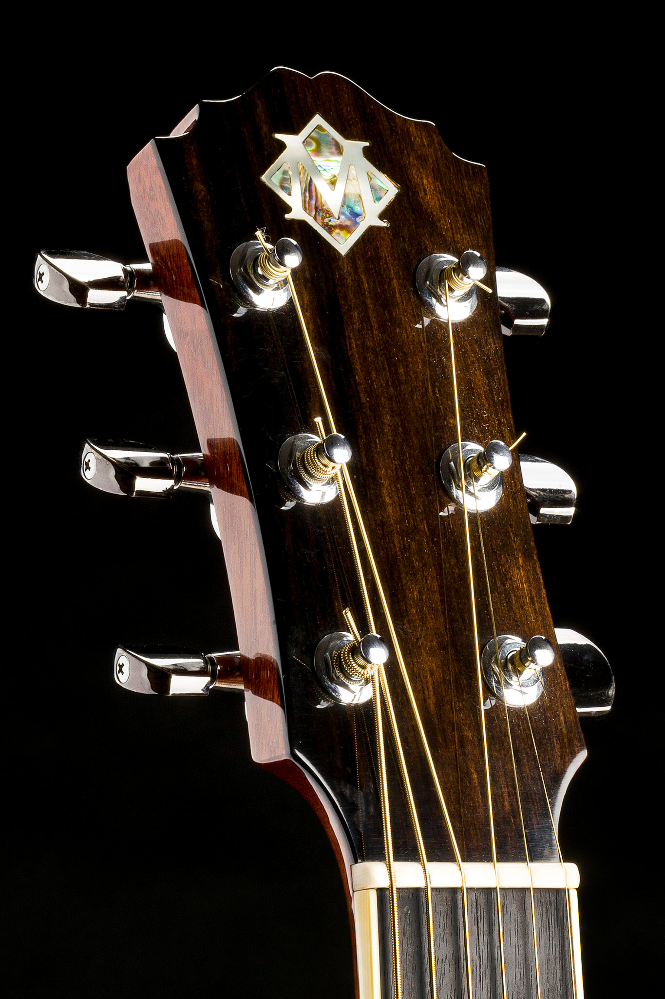 Details speak of a builder who spares nothing: an abalone rosette, mother of pearl and abalone Morgan headstock logo, ebony bridge and fingerboard, and those distinctive Morgan-engraved tuners — all finished in a flawless, deep gloss. The 44.5mm nut width (1¾ inch) provides generous string spacing, ideal for fingerstyle technique.
